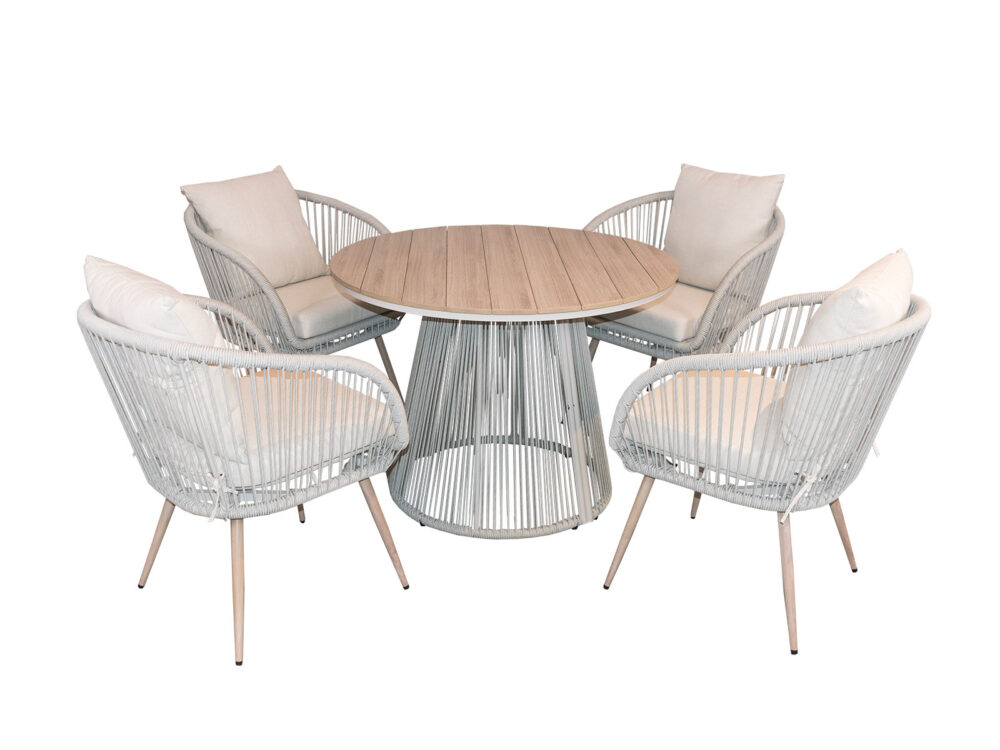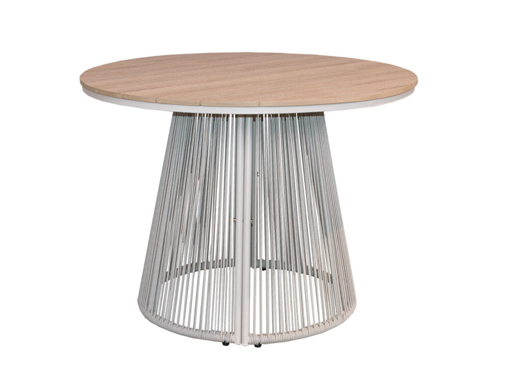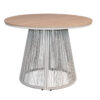 mesa redonda 100cm de diámetro x 74cm de altura. Estructura de aluminio color madera, detalles en la base de tejido aquatech beige, top de polipropileno color madera.