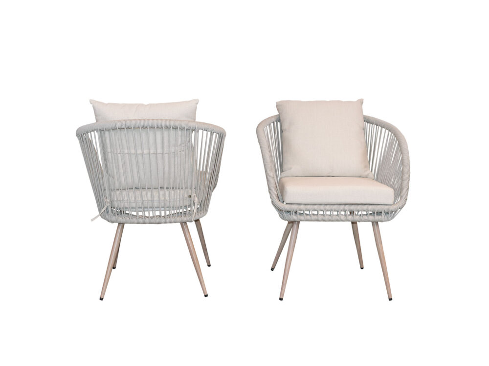 4 sillas, con estructura de aluminio color madera, detalles de tejido aquatech beige y asiento de tela color beige claro.