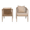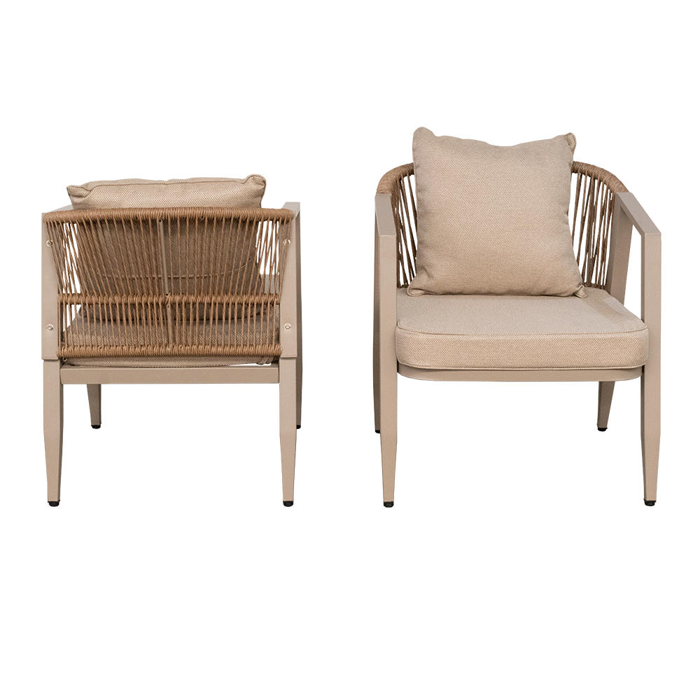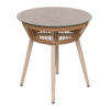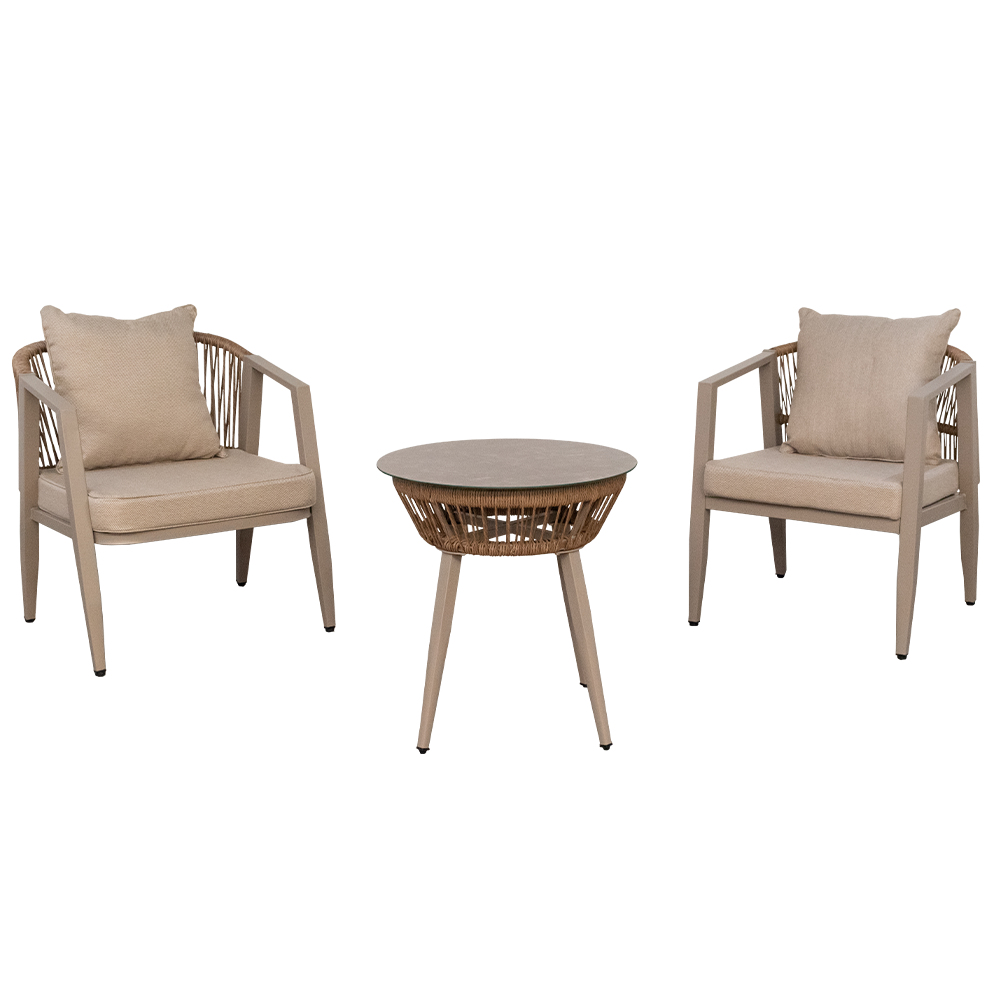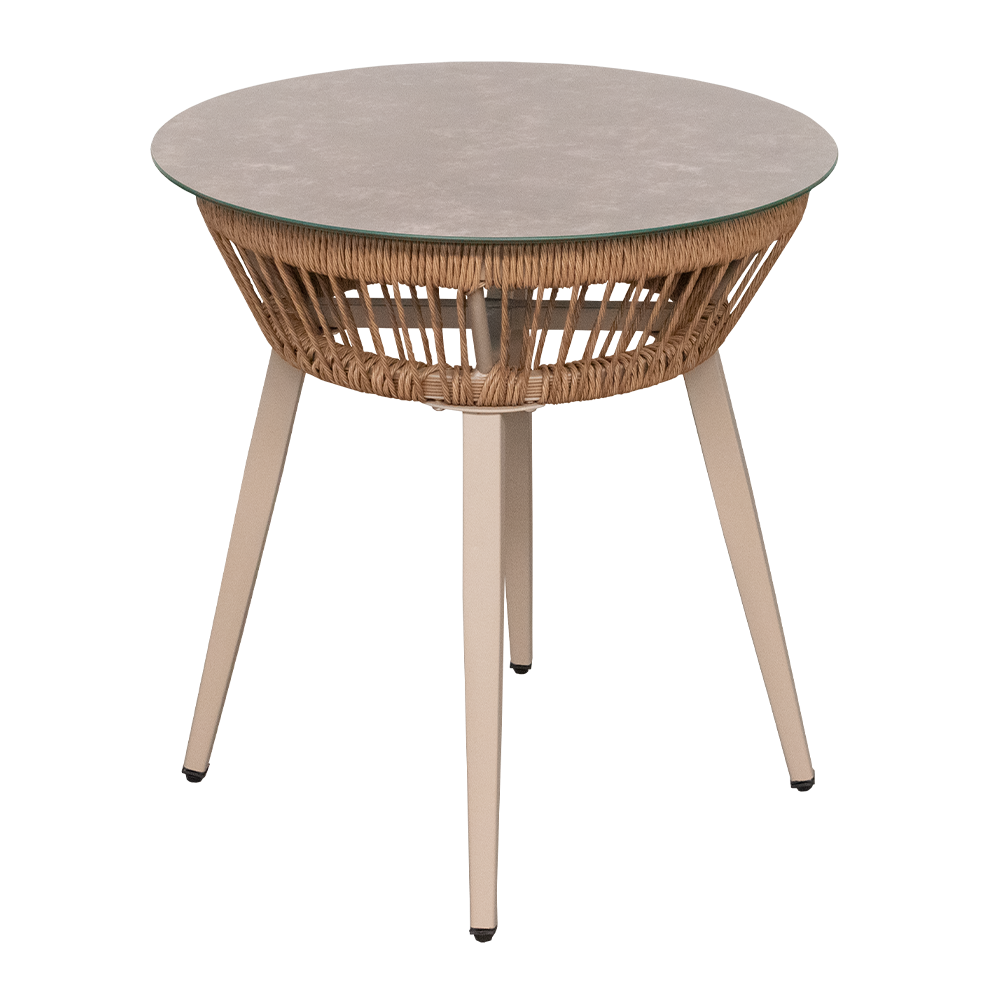 estructura de metal color khaki con detalles de fibra sintética color beige – top de mesa de vidrio templado con diseño marmoleado.