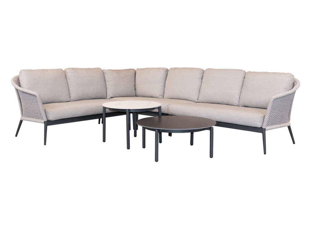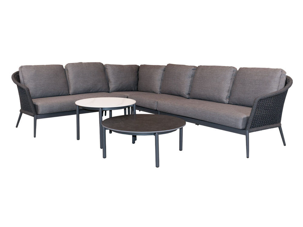 mesa de centro redonda 80cm, estructura de aluminio con top de ceramio color gris oscuro.