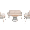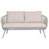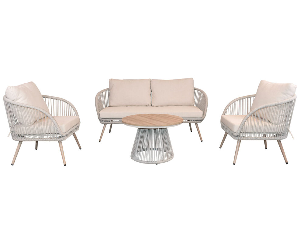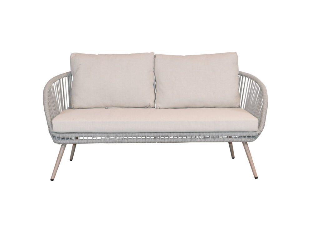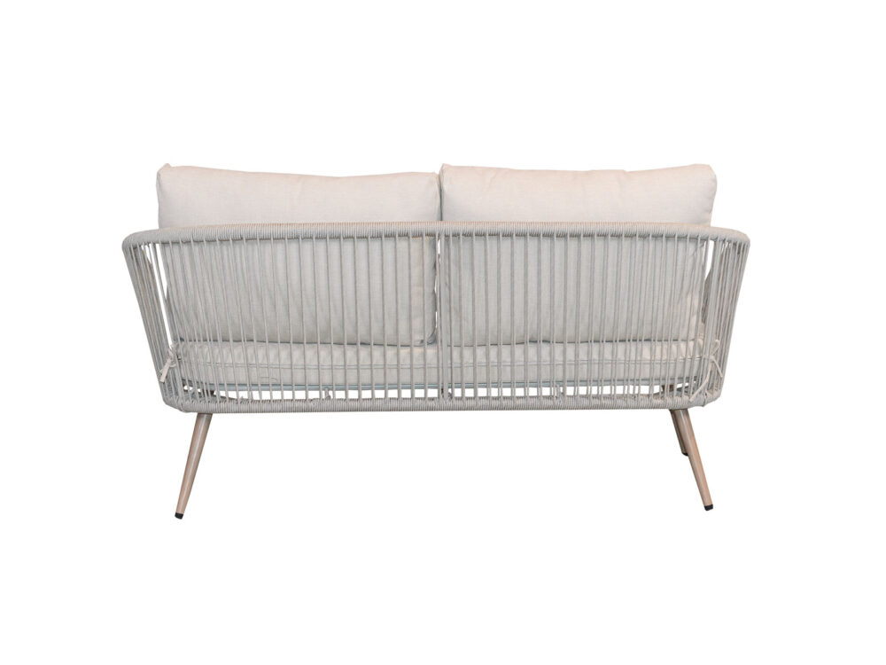 Loveseat: 155x66cm estructura de aluminio color madera, detalles de tejido aquatech beige y asiento de tela color beige claro.
