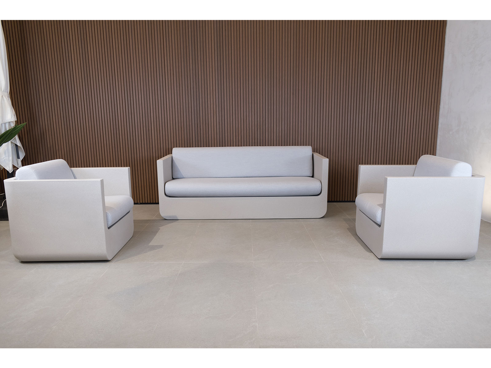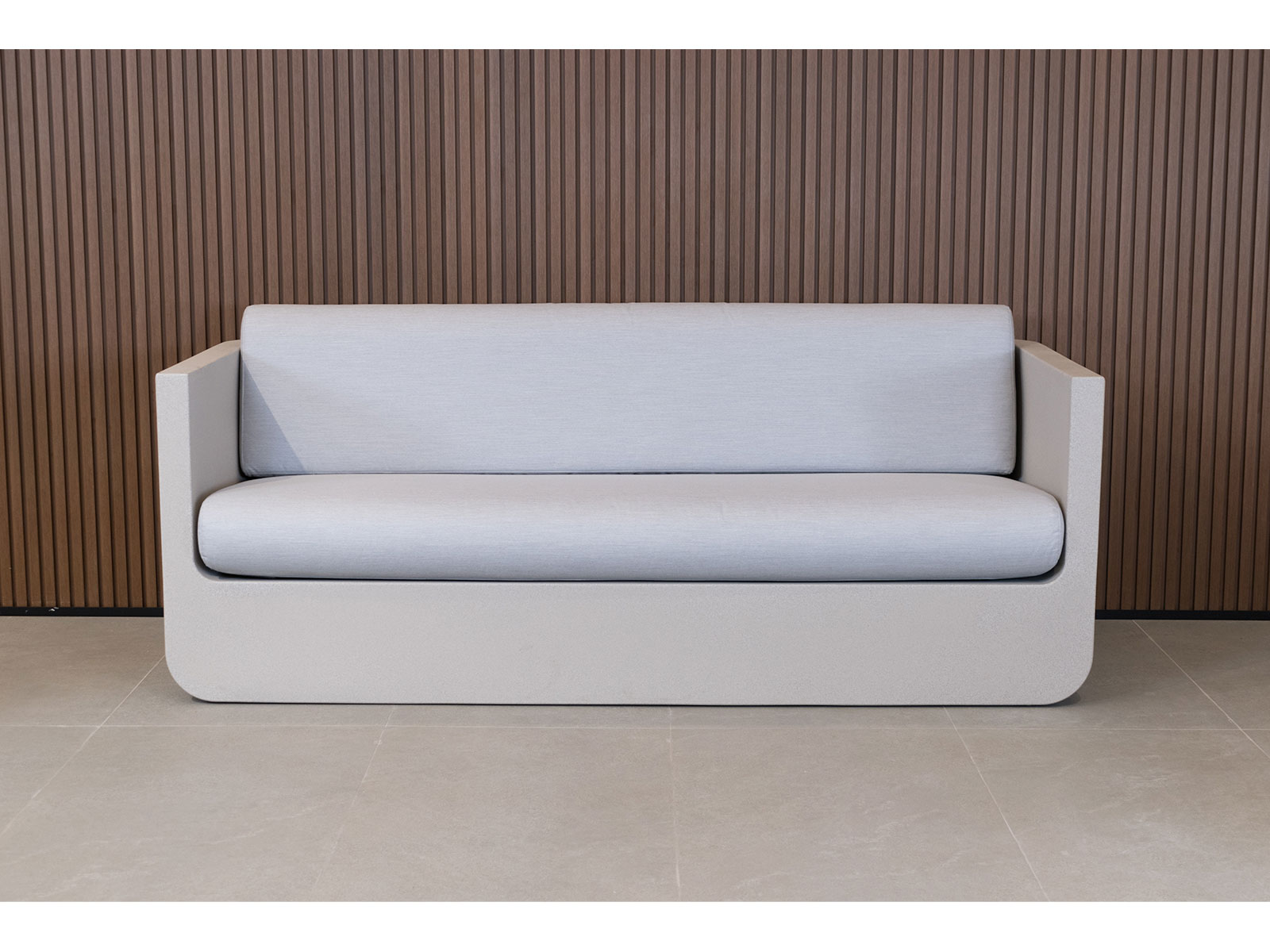 polipropileno color ecru con diseño y textura granito, tapicería de tela gris claro.